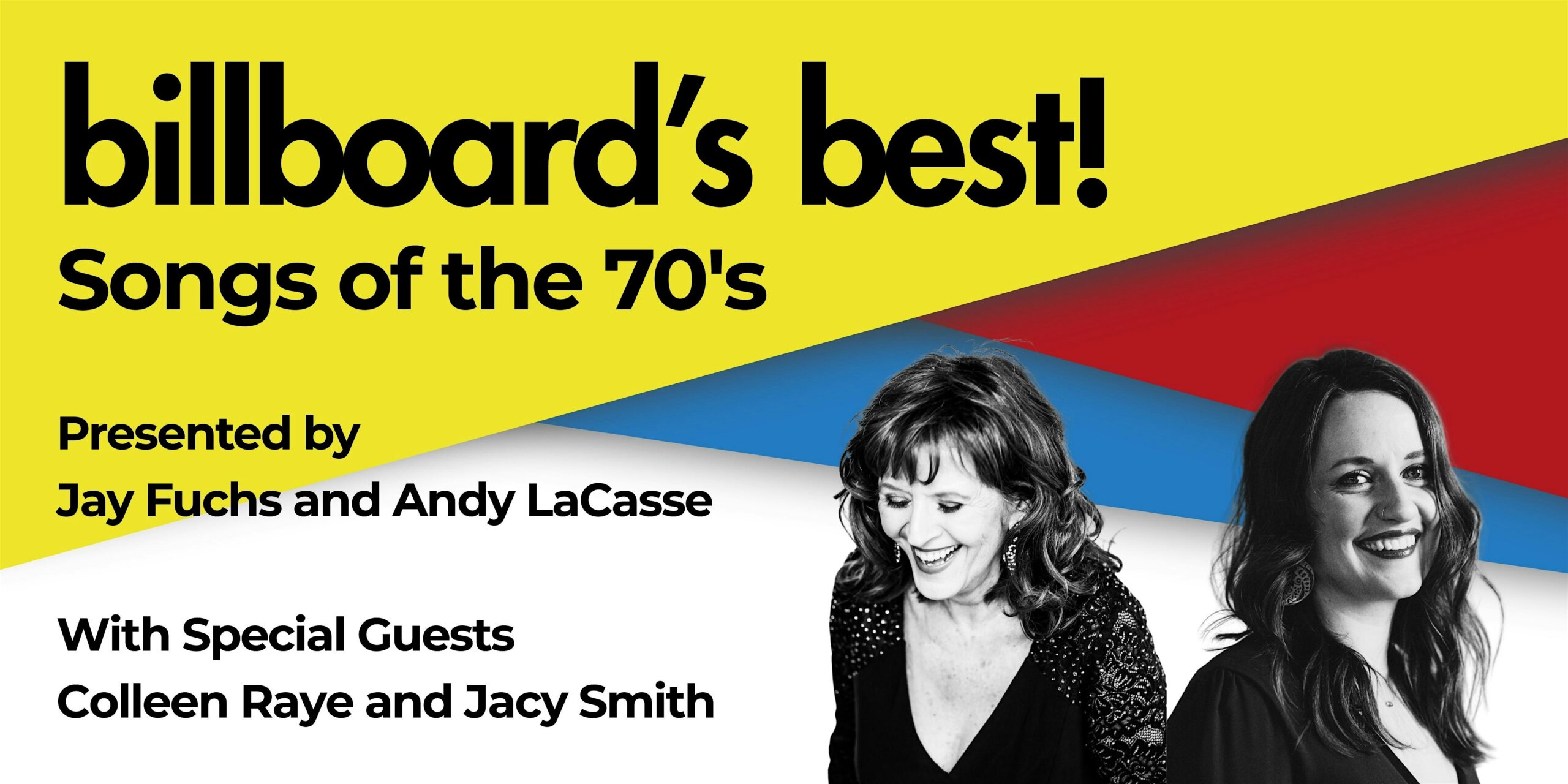Great Songs that were Big Hits on the Billboard Hot 100 Chart! Beautiful and catchy melodies full of romance and fun. Delightfully presented by Jay Fuchs and Andy LaCasse, with special guests, Colleen Raye and Jacy Smith. Get ready for some knockout solo vocals along with lots of sweet harmony! Among the many great artists you’ll hear are Anne Murray, Three Dog Night, Roberta Flack, Johnny Nash, Barbra Streisand, The Eagles, Linda Ronstadt, Rod Stewart, Yvonne Elliman, Fleetwood Mac, and many more. Don’t miss this heartfelt show!