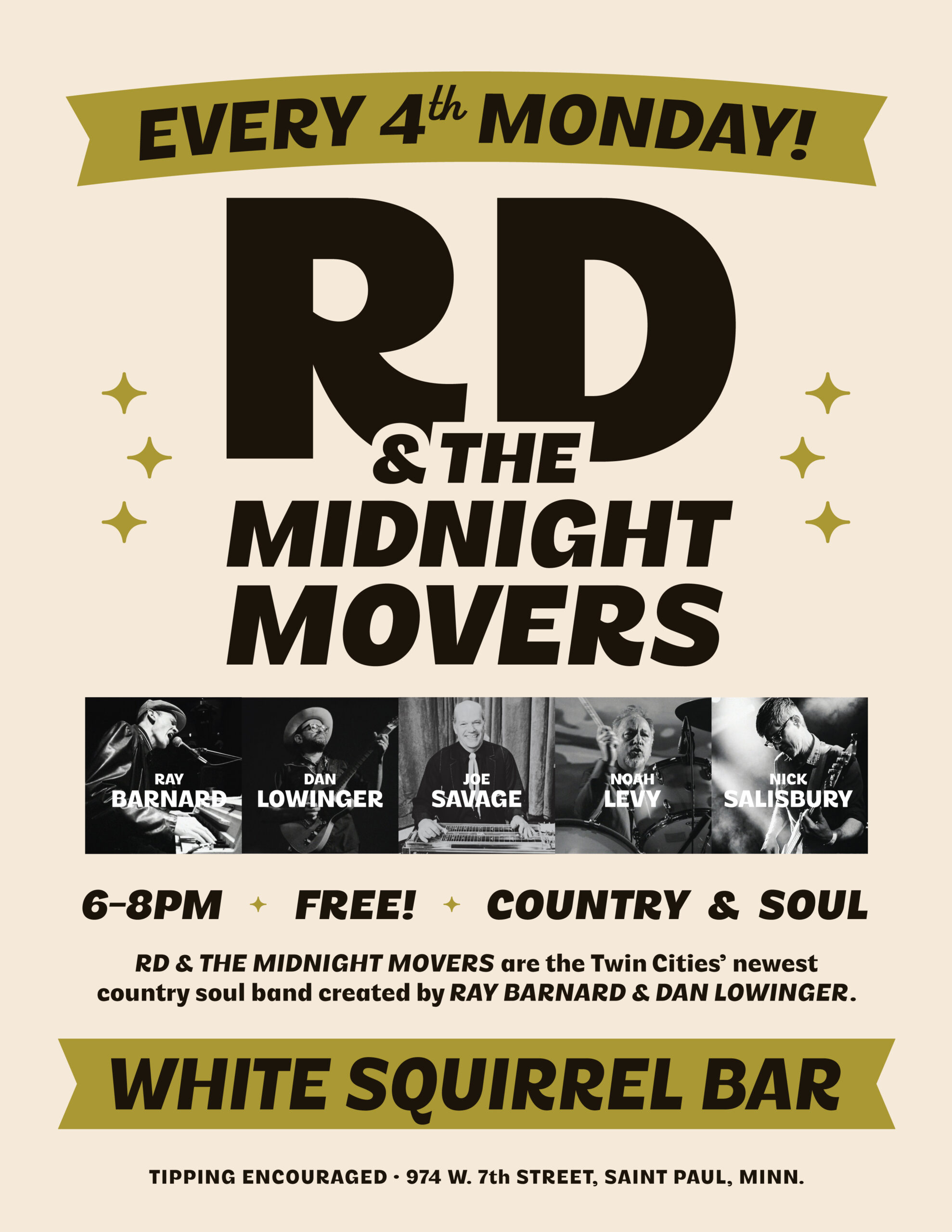 Come on out for the debut of the Twin Cities newest country/soul combo, RD and the Midnight Movers! Led by Ray Barnard (vocal/keys) and Dan Lowinger (guitar), this new project features some of the twin cities best including Noah Levy (Drums), Nick Salisbury (Bass), and Joe Savage (Pedal Steel). Along with playing some of Ray’s originals tunes, they’ll be covering classics by Charlie Rich, Elvis, Arthur Alexander, Booker T and the MG’s, Lonnie Mack, Solomon Burke, Bobby Womack, and others!!