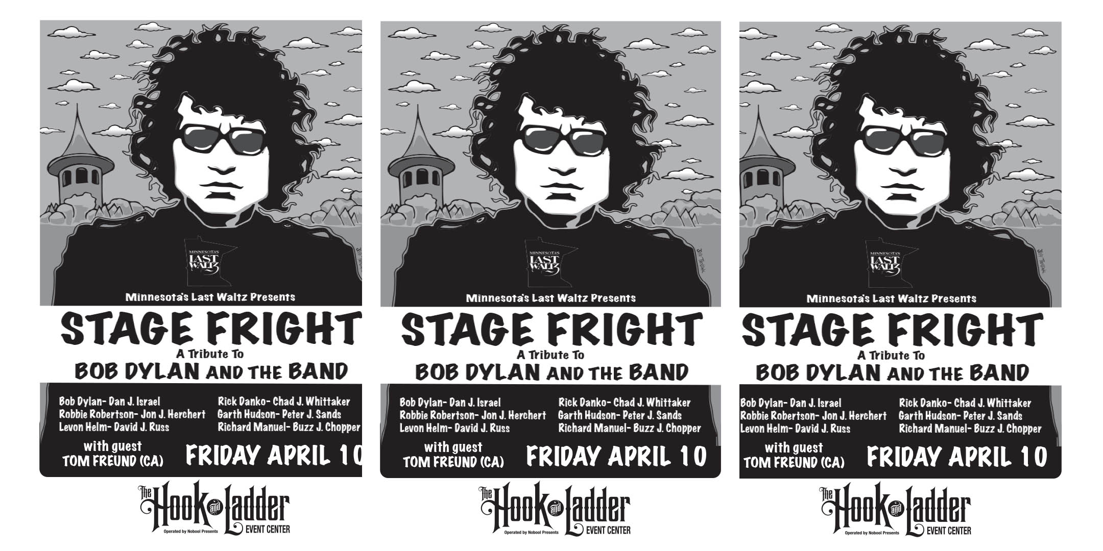 “An all-star Twin Cities band, featuring Dan Israel as Bob Dylan, David J. Russ as Levon Helm, Jon Herchert as Robbie Robertson, Chad Whittaker as Rick Danko, Peter J. Sandsas Garth Hudson, and Buzz Chopper as Richard Manuel (known for their popular annual “Last Waltz” salutes) pay tribute to Bob Dylan and the Band with “Stage Fright,” diving deep into Dylan and the Band’s studio material and live performance repertoire.”