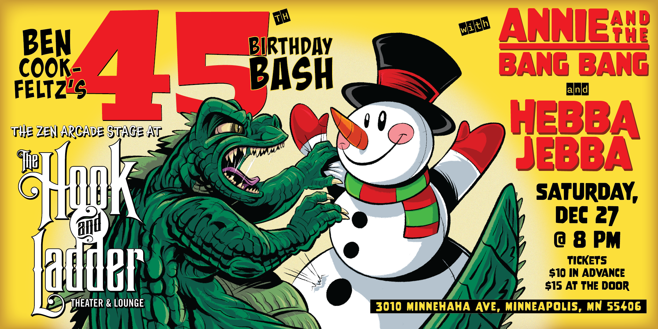 Join us on Saturday, December 27 at The Hook and Ladder’s Zen Arcade Stage as we celebrate the one and only Ben Cook-Feltz and his 45th trip around the sun!